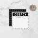 Faça seus próprios cupons de amor com este clássico design preto e branco da frente e design a preto branco com padrão de coração branco nas costas. Excelente para Dia de os namorados, aniversários e recompensas e surpresas do dia a dia! Frente: borda preta da linha tracejada para se parecer com um recorte de cupom. A seção superior tem um fundo preto com texto branco que diz "COUPON" em uma fonte forte e em negrito. Abaixo está "REDEEM FOR" em uma fina fonte de coordenação a preto. A área branca abaixo fica vazio para o texto/desenhos/notas do seu item de cupom manuscrito (incluindo quaisquer detalhes como data de validade, termos e condições ou impressão fino, se desejar). Volta: Um padrão clássico com um fundo preto com um padrão de corações brancos.