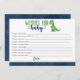 Um cartão de jogo de chá de fraldas plano com o jogo de chá 'Desejos por Bebê' impresso nele. Há um pequeno gráfico de dinossauros e termina com 'amor', junto com um espaço para os hóspedes assinarem seus nomes.