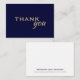 Faça uma impressão duradoura em nosso negócio profissional simples Obrigado a você: Cartões de nota. Este cartão de nota profissional mostra 'Obrigado' em tipografia clássica com script em ouro num elegante pano de fundo azul marinho. A simples parte branca limpa fornece espaço para o nome, endereço, informações de contato ou texto personalizado da sua empresa em tipografia clássica.