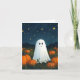 Numa cena noturna mágica, um fantasma branco amigável fica entre abóboras brilhantes num campo estrelado. O céu escuro brilha com formas de estrelas brancas, criando uma atmosfera encantadora para leitores jovens.