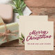 Um cartão de nota "Feliz Natal" moderno minimalista e elegante que pode ser personalizado com seu nome ou mensagem de feriado pessoal. Um script manuscrito "Feliz Natal" magenta rosa em um fundo de marfim de feriado esbranquiçado. A parte traseira deste é um fundo branco correspondente com um design botânico em aquarela lindo e elegante.