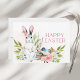 Placa de cartões de natal de páscoa com a ilustração aquosa de um coelho branco de Páscoa com orelhas cor-de-rosa vibrantes aglutinadas junto a uma cesta de cor d'água Ovos de Páscoa rodeados por rosas cor-de-rosa e amarela e verde-natal. Script "Felz pascoa" em negrito ao lado da ilustração. Uma versão menor da ilustração é repetida na parte traseira da carta com espaço para uma nota manuscrita pessoal. Tamanho adicional disponível.
