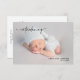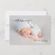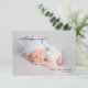 Um simples anúncio de nascimento com a foto do seu recém-nascido com uma camada de "introdução" em um roteiro branco de na moda. Adicione o nome do seu bebê e a data de nascimento. No verso, adicione uma imagem adicional, estatísticas de natalidade e uma mensagem personalizada. Basta clicar no botão editar/personalizar para personalizar este design.