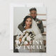Uma placa fotográfica de casamento moderna na moda com seus nomes e data de casamento. Sobreposição de tipo negrito em uma foto elegante. Um cartão de nota elegante para enviar aos amigos e à família.