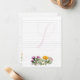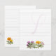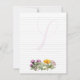 Lined writing paper with flowering herbs design. Small size flat paper with a place for a first name initial as the backdrop for your words. The single letter nearly covers the entire page. A group of herbs, including purple thistle, yellow calendula, and white yarrow, makes a little border at the bottom. On the back, simple calendulas in the corner at the bottom are the only decor. Both sides contain lines. You may change the paper size.