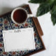 Cartões de papelaria personalizados com linhas pretas, olá em um roteiro, e da mesa do seu nome em letras elegantes. Olá, papelaria em branco com detalhes em preto. Preto e branco da escrivaninha personalizada com o seu nome.