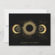 Um estilo celeste de cartão de nota etérea, com uma mandala de ouro moderna, com raios solares, e fases da lua, com uma assinatura bonito e moderna. Faux gold foil efeito.