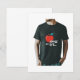 A design de camiseta apresenta uma maçã estilizada com um olho humano em seu centro. A maçã é representada com uma cor vermelha brilhante e vibrante, enquanto o olho é detalhado com uma íris preta e uma aluna. O design geral e estético é pungente, uma dica de surrealismo. A frase "Maçã de Olho" é tipicamente impressa abaixo da imagem, enfatizando o tema central da design