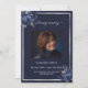 Um elegante programa de 2 páginas. Um fundo azul escuro, um falso quadro prateado, florais azuis e espaço para uma foto. Personalize e adicione nome, datas e texto.