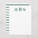 Um design de cartão de nota personalizável atemporal e elegante, com letras profundas em verde caçador que podem ser personalizadas com as iniciais do primeiro, último e nome do meio em tipo serif clássico. Há espaço para a sua nota manuscrita e o verso do cartão apresenta um padrão elegante de listras horizontais em verde e branco.