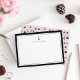 Nossas cartas chic parisienses inspiradas em cartas chic personalizadas de papelaria apresentam uma fronteira negra clássica, uma pequena ilustração negra da torre Eiffel, e seu nome, monograma ou escolha de personalização. Cartões revertem para nosso padrão românico em Paris, com pássaros minúsculos, croissantes, macarões, rosas, xícaras de café e a torre Eiffel em um fundo rosa pálido e pálido.