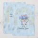 A beautiful blue foil background with a set of gold arches enclosing an image on pink and blue hydrangeas in a watering can.