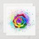 Rosa grande e florescente com pétalas arco-íris sobre fundo branco, pintadas com pedaços de tinta colorida e brilhante. 3d