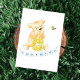 Urso bonito de pelúcia com barril de mel olhando para uma abelha de mel e "Obrigado" em um cartaz azul embaixo. Perfeito para depois de uma chá de fraldas para rapazes. Dentro o cartão tem alguns agradecimentos básicos, anote palavras, espaço para escrevendo e alguns florais azuis. Vem com uma linha de assinatura também. Um frasco de mel nas costas.