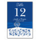 Esta placa romântica de números florais, azul-real e branco, de dois lados, tem uma imagem de um coração azul-real e cinzento-prateado sobre uma imagem de fita azul-real que corre na parte inferior da placa com flores azuis sobre um fundo branco ao longo da parte inferior. Há uma área de texto azul real acima da fita e ela tem o número da mesa, os nomes da noiva e do noivo, e a data do casamento em branco. **VOCÊ DEVE ALTERAR O NÚMERO NA PLACA PARA CADA NÚMERO DE QUE PRECISA, ADICIONÁ-LO AO CARTÃO E, EM SEGUIDA, DEVOLVER E REPETIR O PROCESSO PARA CADA NÚMERO DE QUE PRECISA. Se você precisar de outros itens correspondentes, envie seu pedido por e-mail para niteowlstudio@gmail.com ou use o recurso de bate-papo Zazzle para entrar em contato.