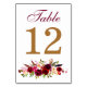 Este simples e acessível cartão de número de mesa de casamento reversível tem uma paleta de cores ousada de burgundy, dourado, vermelho, roxo, laranja, verde, creme e rosa com flores sortidas, folhagens, penas e folhagens na parte inferior. A palavra Mesa aparece em burgundy no topo e o número da mesa personalizável está em uma cor dourada escura. Você DEVE alterar o número 12 para cada número que você precisa, adicioná-lo ao carrinho e, em seguida, retornar e fazer o mesmo para todos os números de mesa que você precisa. O Zazzle não faz sequenciamento, então você deve ter cartões numerados individualmente no seu carrinho para todas as mesas.