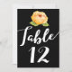 Flor simples, mas elegante, em cor dourada com folhas verdes em cartão de número de mesa preto com tipografia branca. Veja mais em Heart Song Notes aqui na Zazzle.