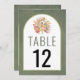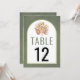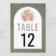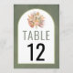 Folhas de palma secas tropicais, erva de pampas e flores de protea, número da mesa de casamento verde. Este bonito design de casamento apresenta um arco sobre fundo manchado verde. No quadro há um buquê de palmeiras secas, flores de proteína e gramíneas-pampas.