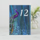 Elegante cartão de número de mesa para recepção de casamento, com gráficos de um fundo de cetim azul-turquesa rico, com um floreio azul e um pavão colorido. Personalize o número branco e o tamanho desejado para o cartão, para cada mesa na sua recepção. Produtos compatíveis disponíveis.