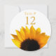 Cartão de número de mesa elegante feito em forma redonda, com gráficos de um grande girassol amarelo espiando de baixo. O texto em amarelo dourado lê Mesa #, com o número amarelo sendo maior que o resto do texto. Personalize um cartão para cada mesa no seu reception. Use um suporte de cartão de florista de plástico transparente para anexar aos arranjos centrais da mesa.