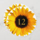Cartão de número de tabela chic feito em forma redonda, com gráficos de um girassol amarelo grande cobrindo a placa, com o número amarelo no centro. Personalize uma placa para cada mesa na sua recepção. Use uma palheta de cartão florista de plástico transparente para anexar aos pedaços do seu centro de mesa.