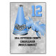 Placa de número da tabela de eventos do cheerleader feita em uma aparência branca e cinza cintilante, com gráficos de um conjunto azul claro de pom e um megafone. Um grande número de tabela azul claro e texto preto no fundo está pronto para personalizar para ler o que você quer. Personalize o número e o texto, um para cada mesa no seu evento.