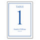 Um clássico cartão de número de tabela de casamento azul e branco, que pode ser personalizado com qualquer número de tabela. Os gráficos aparecem em ambos os lados desta placa.