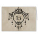 Cartão de Número de Tabela de Casamento de Chandelier Vintage com na moda pendurado em um fundo de aparência antigo bege. A elegância chica deste design torna-o perfeito para um casamento sofisticado. Fácil de personalizar, adicione o(s) número(s) de tabela apropriado(s) no campo de texto fornecido. Clique em "Personalizar" para encontrar mais opções de personalização.