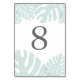 As placas de número de tabela de chic em tons de verde pastel seafoam e cinza média elegante apresentam seu número de tabela moldada por folhas tropicais exuberantes de monstera. Design repete-se no lado oposto. Coordena-se com a nossa suíte de convites de casamento de Trópicos Vintage para assuntos de praia ou casamentos de destino.