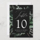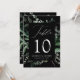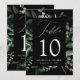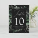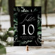 Cartões de mesa de casamento elegantes e botânicos com o número da tabela, seus nomes e data de casamento aninhados em um quadro retangular cercados por eucalipto, samambaias e outros ricos verdes com fundo preto. Personalize o número de cada placa de mesa e adicione-o ao seu carrinho. Os cartões de mesa 5x7 foram projetados para coordenar com nossa coleção de casamento Abundant Greenery.