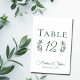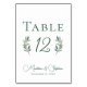 Um simples roteiro de caligrafia verde elegante com duas folhas de eucalipto aquáticas em ambos os lados do número da tabela do seu casamento outono. Chic, decoração de casamento da noite moderna para uma ocasião de jardim à noite.