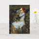 Cartão de John William Waterhouse Ophelia. Pintura a óleo em canvas desde 1894. O Waterhouse inglês de John do artista tirou freqüentemente em temas literários, e Shakespeare era uma de suas grandes fontes de inspiração. Pinturas múltiplas dedicadas Waterhouse à heroína condenada Ophelia de Hamlet. Esta pintura adiantada caracteriza a menina que veste uma luz - vestido azul com bordado do ouro e os braceletes jeweled. O cabelo de Ophelia é castanho-aloirado e decorado com obscuridade - flores vermelhas. Senta-se na borda de um cheio da lagoa de lírios de água com as margaridas em seu regaço. Um grande presente para fãs de J.W. Waterhouse, de Shakespeare, de Ophelia, dos Pre-Raphaelites, e da pintura romântica inglesa.