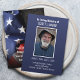Cartão de oração memorial de funeral azul com sua foto favorita em moldura. Tipografia moderna é usada. No verso do cartão há texto adicional que pode ser personalizado sobrepondo a bandeira dos EUA.