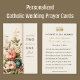 Apresentando um belo design floral com o verso das escrituras ...e as duas devem ser de uma só carne " dos efesianos 5:31. Uma oração está atrás da noiva e do noivo com uma imagem dourada dos "TRÊS CORAÇÕES... Jesus, Maria e Rua. Joseph.