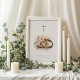 Apresentando uma bela imagem católica tradicional de um crucifixo de ouro com duas alianças acentuadas com flores. Os corações de Jesus, Maria e José estão nas costas. Uma oração também está nas costas para a noiva e o noivo. Todo texto e fontes podem ser modificados.
