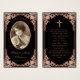 Um cartão de oração memorial com ar vintage para um funeral. Em ambos os lados, é preto e tem uma elegante imagem de ouro barroco vintage (faux) rosa. Na frente, há uma foto oval vintage com borda dourada rosa e texto rosa acima e abaixo dela. As palavras "na memória amorosa" são arquivadas acima da foto. O nome é escrito sob ele em um roteiro caligráfico elegante. No verso há uma oração, em bonés cor-de-rosa, com uma cruz de ouro rosa. O pano de fundo com as suas elegantes decorações barrocas de ouro sobre a ligação de couro azul é de uma coleção de cobrir franceses, de Georges Mercier (1885-1939) - Madame de Maupin, por Teophile Gautier, volume 1, edição 1911, Paris - agora no dominio público, da Biblioteca Pública de Nova Iorque. A foto marcante, um retrato de sépia antigo de uma jovem no início dos anos 1900, foi oferecida por Zoltan Matuska, de Pixabay, livre para uso comercial.