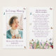 Este é um cartão de oração memorial moderno e elegante. A design apresenta uma bela fonte de caligrafia e borboletas delicadas e flamejantes com flores adoráveis, cor-de-rosa e roxas, no verso. Este cartão de oração funerária pode ser facilmente personalizado com sua própria foto para criar um tributo especial para seu ente querido usando o modelo fornecido. Entre em contato com o designer para obter informações sobre este design ou sobre produtos correspondentes.