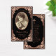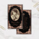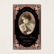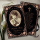 Um cartão de oração memorial com um ar vintage para um funeral. Em ambos os lados, é preto e tem uma moldura dourada rosa (falso) barroca elegante e vintage. Na frente, há uma foto oval vintage com borda dourada rosa e texto rosa acima e abaixo dela. As palavras "em memória amorosa" estão arqueadas acima da foto. O nome está escrito abaixo dela em uma elegante caligrafia. No verso há uma oração, em letras maiúsculas rosa, com uma cruz dourada rosa acima dela.