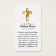 O design durável faz o cartão perfeito de memória para entrar em uma carteira ou obrigado nota. A frente é uma foto de cheio do seu amado. Uma cruz de ouro é colocada no topo. Logo abaixo, na memória amorosa do, o nome e as datas de vida do falecido. Há espaço para seu verso ou oração favoritos da Bíblia.