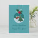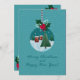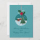 Cartão de férias em azul-turquesa com um ornamento de vidro com uma aldeia nevada e uma árvore de Natal, encimado por azevinho e um laço vermelho. Fundo nevado e saudação manuscrita. Personalize os nomes, ano e mensagem interna - perfeito para familiares, amigos, professores e colegas de trabalho.