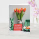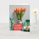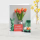 Este cartão de cumprimentos mostra uma cena de mesa de primavera colocada contra um fundo branco brilhante, arranjada com uma sensação calma e próxima, como amigos se inclinando para uma foto. À esquerda, senta-se um coelho de cerâmica verde brilhante com orelhas eretas e rosto relaxado 🐰. Logo ao lado, um cartão vermelho fica em pé com uma curta mensagem de Páscoa centralizada em letras brancas pequenas, chamando o olhar como um bilhete silencioso passado entre os entes queridos. Atrás deles, um buquê de tulipas se ergue de um vaso de prata canelado, com pétalas mudando de laranja para amarelo suave e hastes verdes preenchendo o espaço com cor fresca 🌷. À direita, uma caixa de papelão verde-claro segura ovos decorados, misturando pontos pretos, manchas laranja e listras simples que parecem cuidadosamente escolhidas em vez de apressadas. A luz suave e difusa alisa as superfícies e adiciona destaques suaves à cerâmica, ao vaso e às cascas de