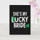 Este cartão apresenta um fundo preto profundo com a frase “SHE'S MY LUCKY BRIDE” centralizada em três linhas empilhadas de branco texturizado, dando às letras uma aparência levemente desgastada. As palavras estão próximas umas das outras, como um anúncio confiante, e o layout parece íntimo, como se alguém estivesse orgulhosamente reivindicando sua pessoa favorita. Um trevo esmeralda brilhante substitui o “U” em “LUCKY”, suas três folhas em forma de coração formando a curva e adicionando um piscar romântico 💚. Outro trevo menor aparece como um acento arrumado logo após “BRIDE”, como um floreio no final de um brinde ☘️. O forte contraste entre o campo preto e o texto branco torna a mensagem fácil de ler à distância, enquanto os detalhes verdes atraem o olhar de volta para uma visão mais próxima. A letra branca permanece consistente em todas as três linhas, com os trevos fornecendo a única cor, de modo que o design parece focado e afetuoso sem precisar de imagens extras. Centralizado no cartão, as quebras de linha colocam “SHE'S MY” no topo, “LUCKY” no meio com a letra-trevo