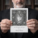 Bela imagem em preto e branco da arte tradicional católica do Sagrado Coração de Jesus. Dentro está o versículo da escritura "Eu irei ao altar de Deus, o Deus que dá alegria à minha juventude" e um versículo no lado direito do cartão.