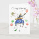 Um cartão de parabéns de casamento com um casal a sair num carro vintage com balões e garrafas velhas e latas de estanho, e um aviso de "Recem casados" no lugar da placa de matrícula. A noiva está jogando seu buquê atrás dela e o noivo está acenando seu chapéu de cima; de uma pintura aquosa feita por Judy Adamson.