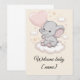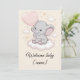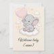 A maneira mais doce de dar as boas-vindas a um pequeno ao mundo! Este cartão de chá de bebê apresenta um pequeno elefante em uma nuvem fofa, segurando um balão cor-de-rosa em forma de coração, com estrelas pastéis suaves ao redor. Adicione o nome do bebê para um toque pessoal que torna este cartão um verdadeiro tesouro. Perfeito para um chá de bebê de menina, para acompanhar seu presente ou para enviar como parabéns sinceros.