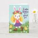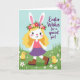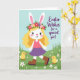 Este cartão mostra uma cena de primavera com uma figura em pé semelhante a um coelho, desenhada com cabelos dourados ondulados e longos, orelhas brancas macias, bochechas rosadas, olhos brilhantes e um nariz pequeno em forma de coração 🐰. Uma coroa de flores de cores vermelha, rosa, amarela e violeta repousa sobre sua cabeça, e seu sorriso gentil e postura relaxada sugerem um clima amigável e afetuoso. Ela está ligeiramente à esquerda do centro, vestindo uma blusa cor-de-coral, uma saia lavanda fluída e botas marrons, como se estivesse fazendo uma pausa para compartilhar um momento tranquilo ao ar livre. No lado direito, uma curta mensagem aparece em letras cursivas roxas, destacada contra o céu aberto para facilitar a leitura. Colinas verdes onduladas se estendem ao longo da parte inferior, pontilhadas com minúsculas flores brancas que parecem estrelas espalhadas por uma brisa leve 🌷. Dois pintinhos amarelos fofinhos com bicos laranja permanecem próximos — um perto de