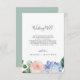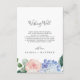 Este cartão de poço de desejos de casamento de hortênsias azuis elegantes é perfeito para um casamento de primavera ou verão. O design floral clássico apresenta hortênsias em azul-pó suaves aquareladas, acentuadas com flores cor-de-rosa neutras e folhas verdes. Personalize este cartão de inclusão de convite com seus nomes e um curto poema de poço de desejos.