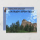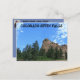 Uma foto da área Sete Cataratas com uma Montanha, Árvores e céu azul com nuvens brancas que são brilhantes e coloridas. Está num cartão POSTE.