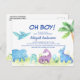 Brachiosaurus, Stegosaurus, Pterodactyls, Dinossauros que têm uma aquarela tropical verde-azulada Oh Boy Baby Shower Invices Posta Cartão com fundo branco com o bebê TRex - inclui uma bela e elegante tipografia com palmeiras tropicais modernas e verde para a festa especial Mãe a Ser.