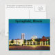 Cartão postal, foto ao anoitecer do horizonte do centro em Springfield, Illinois. O museu presidencial de Abraham Lincoln está em primeiro plano.